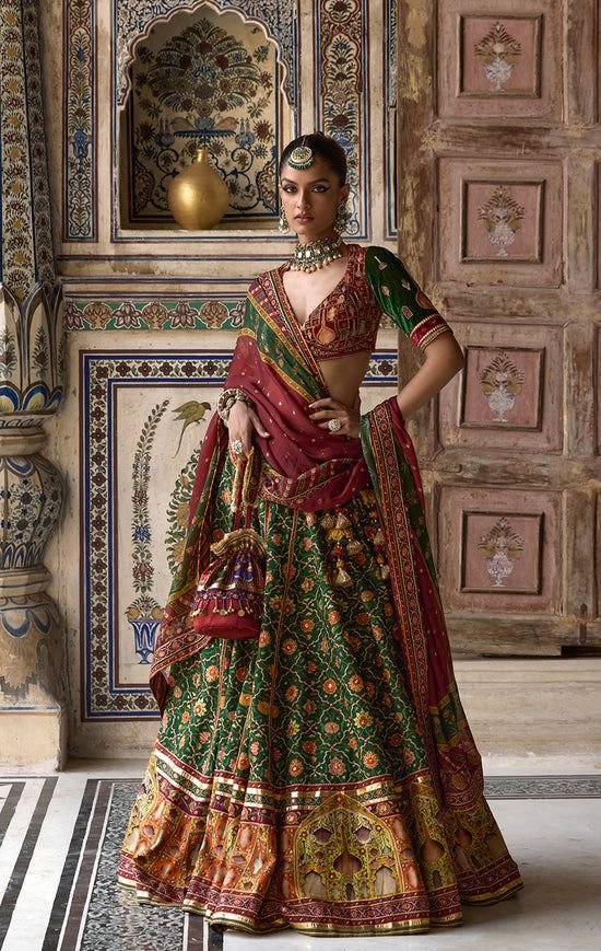 This luxurious lehenga features a rich emerald green base adorned with intricate handcrafted floral motifs, detailed zari, and heritage-inspired borders. The deep maroon dupatta with ornate embroidery adds a regal contrast, while the heavily embroidered blouse completes the royal look.