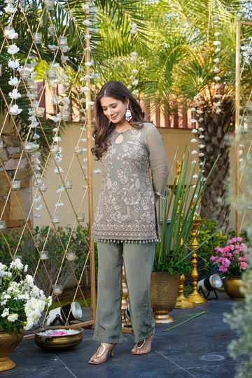 Elevate your festive style with this stunning Sage Green Embroidered Suit Set. Featuring delicate threadwork, sheer sleeves, and matching straight pants, this outfit blends grace and comfort for any special occasion.