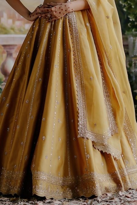 The structured blouse with intricate detailing enhances the silhouette, while the lightweight organza dupatta with embroidered borders adds an ethereal touch. Perfect for haldi ceremonies, weddings, festive gatherings, and daytime celebrations, this lehenga blends sophistication with effortless elegance.