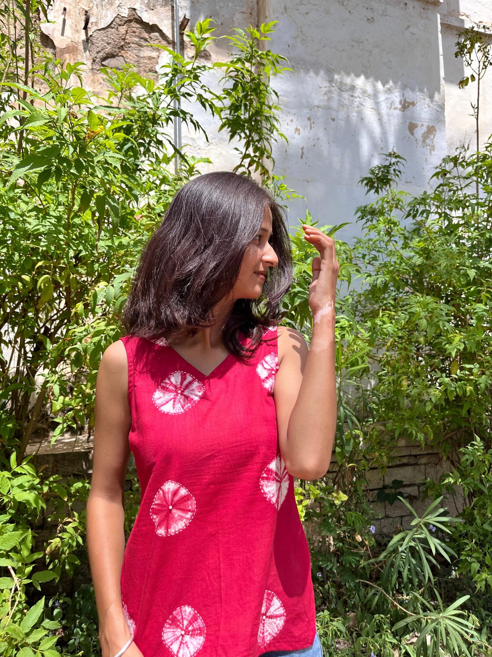 Upgrade your everyday style with this soft and breathable sleeveless cotton top, featuring beautiful tie-dye circle motifs. Designed for comfort and effortless fashion, this top is perfect for casual outings, summer days, travel, and daily wear.